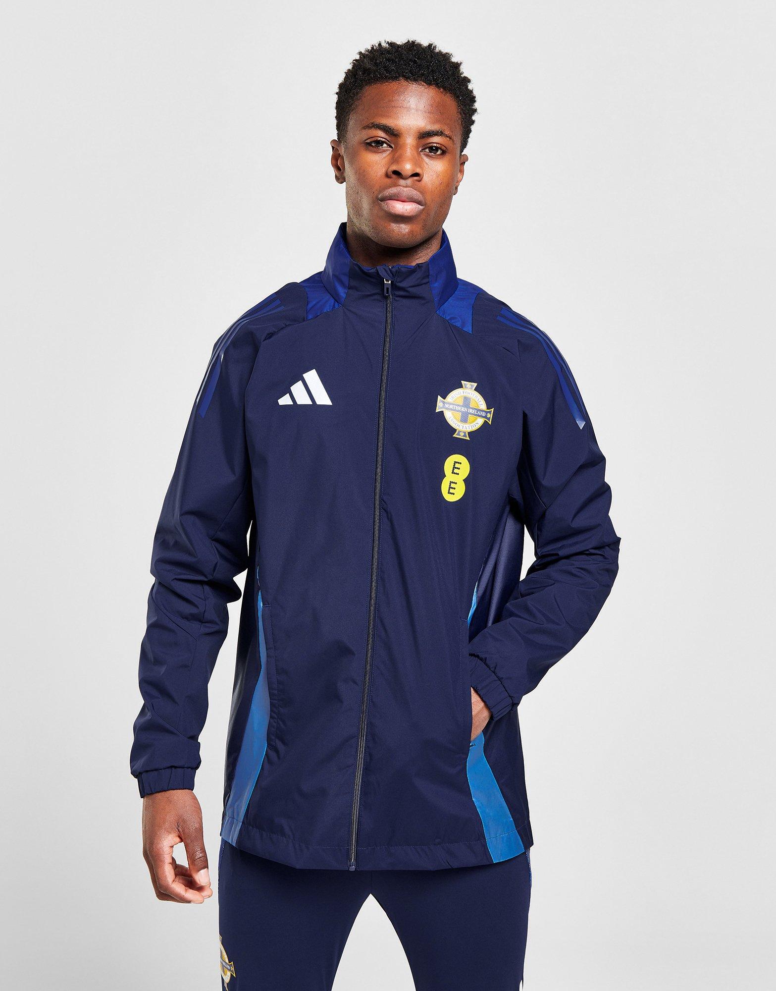 Don't let bad weather get in the way of following your team with this men's Northern Ireland Tiro 24 All-Weather Jacket from adidas. Landing in a Team Navy Blue 2 colourway, this jacket is made with a water-repellent recycled poly fabric and has a breathable mesh lining. It features full zip fastening with a packable hood so you can customise your coverage, and has front zip pockets for keeping your essentials close. Signed off with the Performance logo and Northern Ireland badge to the chest. | IR9520